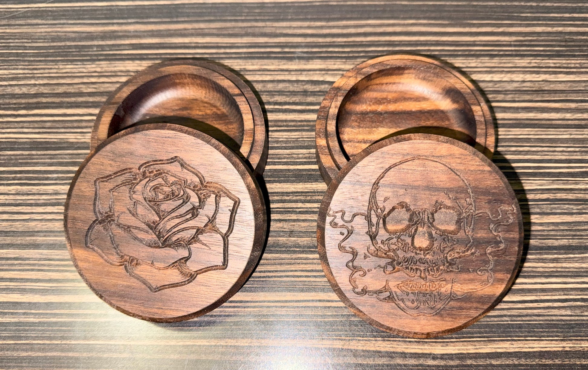 these are small round boxes made from exotic hardwoods, and can be used for various items such as jewelry, or a small stash.